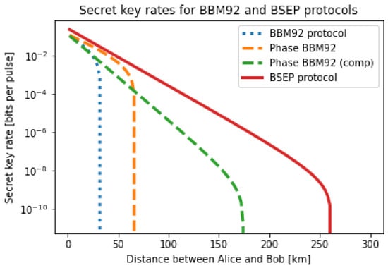 Secret key rate comparison between protocols for the realistic value (units of km) and the hypothetical value . Four cases are considered: BBM92 with full perturbations (phase + coupling) and no autocompensation (blue dotted line); BBM92 when only phase perturbations are present with and without autocompensation (green and orange dotted lines, respectively); and the BSEP protocol (red solid line).