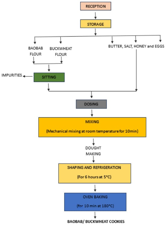 The cookies were prepared according to Farzana et al., 2022, and Mounjouenpou et al., 2018 [18,34], with some modifications. All ingredients (honey, salt, butter, and egg) used for the formulation of the different cookies, except baobab and buckwheat flour, were acquired from the Profile supermarket, in Timisoara, Romania. Four (4) types of cookies (CC, BBC1, BBC2, and BBC3) were formulated with different levels of substitution of BWF by BF (CC—control cookie with 100% BWF; BBC1—biscuit with 10% BF and 90% BWF; BBC2—biscuit with 20% BF and 80% BWF; and BBC3—biscuit with 30% BF and 70% BWF). The dough was obtained by mixing honey, salt, butter, egg, and flour (Figure 1). It was then rolled up in a biodegradable plastic bag and placed in the fridge. After 6 h in the fridge (at 5 °C), the biodegradable plastic bag was removed, the dough cut into rounds, and placed in the oven at 180 °C for 10 min.