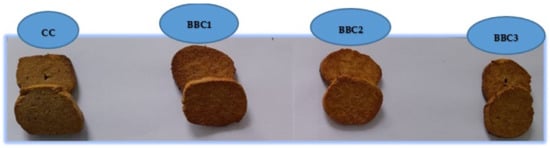 Control cookies and cookies with different proportions of buckwheat/baobab composite flour (CC—control cookie with 100% buckwheat flour; BBC1—cookie with 10% baobab flour and 90% buckwheat flour; BBC2—cookie with 20% baobab flour and 80% buckwheat flour; and BBC3—cookie with 30% baobab flour and 70% buckwheat flour).