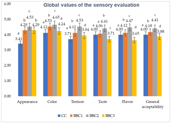 Overall sensory-evaluation values (consumer acceptance). Column values represent the mean of three determinations ± standard deviation (SD). Within each characteristic category, statistically significant differences (p < 0.05) are indicated by different letters (a–d) in the columns. CC—control cookie with 100% buckwheat flour; BBC1—cookie with 10% baobab flour and 90% buckwheat flour; BBC2—cookie with 20% baobab flour and 80% buckwheat flour; and BBC3—cookie with 30% baobab flour and 70% buckwheat flour.