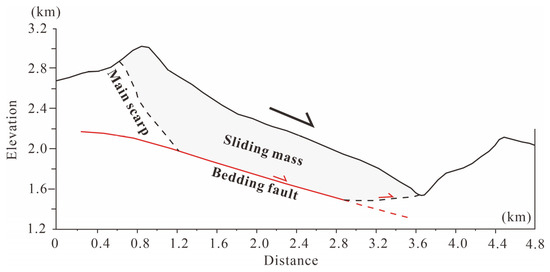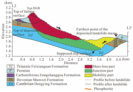 The DGB landslide, with a volume of 1.2 × 109 m3, changed the topography of about 7.2 km2 in the area, and the maximum length of the landslide area was 4.6 km. The profile shows the mass loss part, junction part and mobility part. The mobility mass was driven to be thrust on the slope on the other side of the valley with a height of 500 m. The landslide initiated along a bedding fault (Figure 1) [31,32]. The exposed rocks of the mass loss part and mobility part is main Carbonate rock and sandstone, and its lithology distribution has a good hierarchy, the west-to-east lithology is Tf → P → Ds → Zd and the geological time is from new to old. It is generally consistent with the pre-stagnate sequence characteristics of DGB landslide, indicating that although the scale of the landslide is huge, the sliding distance is not large, and the degree of disintegration of the accumulation is not high [33].