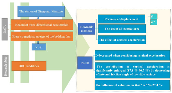 The framework for studying the influence of vertical seismic acceleration on bedding fault-constrained landslide triggering under an inertial frame of reference is shown in Figure 2. This flowchart shows the beginning of the research with two parts: data and research object. The vertical seismic acceleration and c, ϕ are used for computing the permanent displacement by Newmark method. Then, D/D*, the effect of the inertia force and vertical acceleration, are analyzed to reverse the variation in permanent displacement, and the impact of internal friction angle (ϕ) and cohesion (c) on the D/D*.
