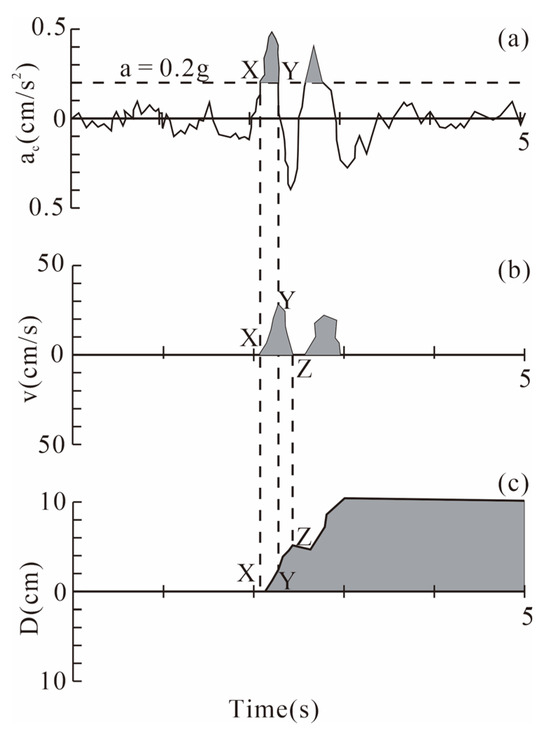 where is the critical acceleration, D is the permanent displacement, is the pre-earthquake stability factor, g is the gravity acceleration (taken as 9.8 m/s2), is the inclination of sliding surface, t is the time and is the earthquake acceleration.