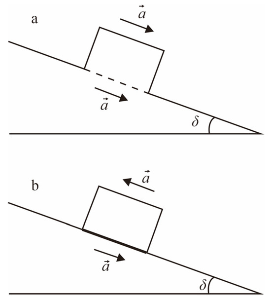Schematic diagram of the acceleration direction of the slider and the base considering the non-inertia (a) and inertia forces (b) [39].