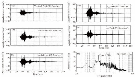 Seismic records from the Qingping seismic monitoring station during the Wenchuan eart-quake, (a–c) accelerations in vertical (UD), east–west (EW), and north–south (NS) directions, respectively; (d,e) referred down-dip acceleration (downward positive) and normal acceleration (upward positive) along the sliding surface, respectively; (f) the frequency spectrum of .