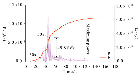 where is the Fourier amplitude spectrum of seismic acceleration along the sliding surface (cm/s), A is the sliding surface area (m2), is the shear wave velocity (m/s), = 1 × 103 m/s, and is the density (kg/m3). The calculation results are shown in Figure 10. After the start of the earthquake, the initial energy growth is slow, and the energy increases rapidly in the period of 30–50 s. The energy release reaches 49.8% of the total energy in just 20 s. The energy growth slows down after 50 s and gradually approaches the final value after 120 s. The maximum energy release rate was about 45 s.