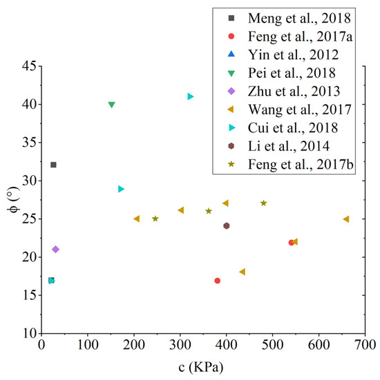 Previously, a large number of tests have been conducted to obtain the mechanical parameters of the sliding surface material, and these tests mainly include direct shear test, medium shear test, on-site large shear test, vane shear test, etc. The test results are shown in Figure 11. Among all the obtained test data, cohesion (c) has a maximum value of 660 kPa and a minimum value of 20 kPa. The internal friction angle (ϕ) has a maximum value of 41° and a minimum value of 17°. The average values of c and ϕ are 340 kPa and 29°, respectively. However, it is noted that all these tests are small displacement shear and do not include test results about velocity weakening, displacement weakening, liquefaction, melting, etc. [42,43,44,45,46]. In this study, we mainly analyze the initiation process of the DGB landslide under strong earthquakes, and the small displacement is generated in the process. Therefore, it can be reasonably assumed that the material strength weakening associated with long-distance shear is still not generated, and ignoring the strength weakening parameters has less influence on the calculation result.