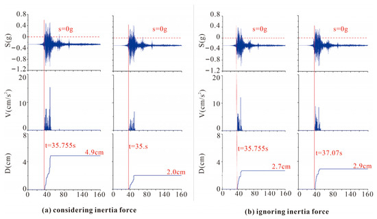 The Fs of the DGB landslide obtained by Equation (3) is about 1.9 (greater than 1), indicating that the DGB landslide was in a stable state before the earthquake, which is consistent with the conclusion of the static analysis of the rigid block by Dong et al. (2017) [18]. Furthermore, we obtain the critical acceleration of the DGB landslide through Equation (1), which is 0.27 g (263.62 cm/s2). As shown in Figure 12, the peak value of S is significantly larger than the peak value of S1, proving that the vertical acceleration increases the permanent displacement of the slider. In addition, the peak value of S* (−994.8 cm/s2) is only slightly larger than that of S1* (−983.4 cm/s2). The permanent displacement that is influenced by the vertical acceleration and the inertial force is significantly larger than in the other three cases (i.e., only no vertical acceleration, only no inertial force, no vertical acceleration and inertial force).
