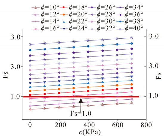 To reveal the effect of the cohesion and internal friction angle on the stability coefficients of the DGB landslide before the earthquake, the cohesion was taken from 0 to 700, with 8 values at a spacing of 100, and the internal friction angle (ϕ) comprised 16 values from 10 to 40° at a spacing of 2°. As shown in Figure 13, the Fs < 1 of the DGB landslide was obtained by some of the above parameters. We removed the parameters that made Fs < 1. The selection of the internal friction angle (ϕ) ranged from 14° to 40°.