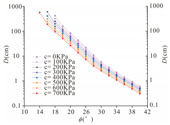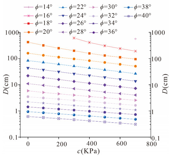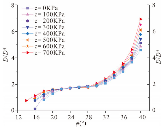 The relationship between the D/D1 and internal friction angle under different cohesions.