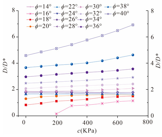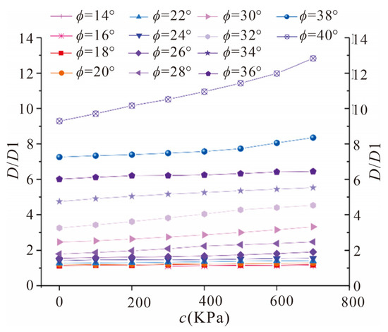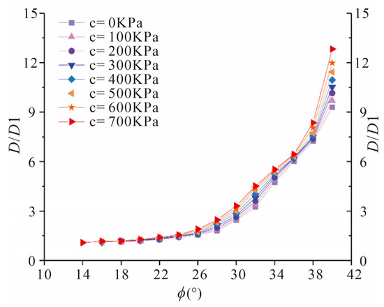 The relationship between the D/D1 and cohesion under different internal friction angles.