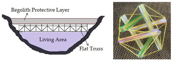 Extraterrestrial outpost designs were initially proposed three decades ago. Nowak et al. proposed inflatable structures made of lightweight composites to build lunar habitats [13]. Aside from lightness, these inflatable structures could easily be compacted during transportation from the Earth to the Moon. Moreover, the outpost’s erection could be carried out using low amounts of energy, and this is carried out by construction robots. Benaroya and Ettouney suggested the utilization of a 3D flat truss for the development of lunar bases (Figure 1 (left)) [14]. The members of the truss were made of light aluminum. Furthermore, the truss was installed on a naturally available lunar valley. To protect the outpost from the outer harsh environmental conditions, the roof of the truss was covered by the local regolith. Shortly thereafter, Benaroya put forward the idea of using tensegrity assemblies for space habitats [15]. Tensegrity structures includes a series of interlocking cables and bars capable of forming an intertwined structure (Figure 1 (Right)).