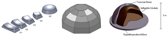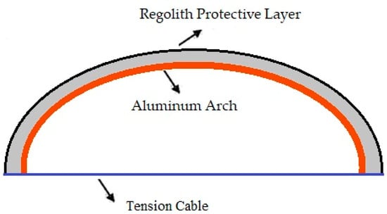 In the middle of the 2000s, the concept of deployable modules was suggested for the establishment of extraterrestrial outposts [17]. The deployable structures encompass size-variable components, which can be stowed during Earth-to-space transportation, and then, they can be expanded to a desirable size and shape. For example, two typical deployable structures include the umbrella and TV antenna. In the same years, the idea of arch structures was also offered by [18,19]. In these propositions, the main structural module was a semicircular arch made of light aluminum together with a regolith-based roof for sheltering human habitants against hostile environmental conditions (Figure 2).