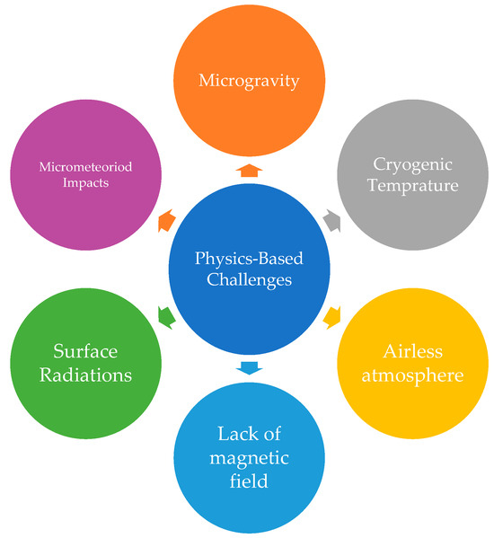 As it was already mentioned, there are several physics-based challenges restricting the outpost development on the Moon and Mars. These challenges comprise microgravity, cryogenic temperature, the non-existence of adequate atmospheric pressure, a lack of magnetic fields, extreme surface radiations, and micrometeoroid impacts. Figure 3 shows these challenges. Any conceptual lunar or Martian outpost must meet the specifications related to these challenges. In the case of access to inclusive data related to these challenges, artificial intelligence approaches can be used to analyze the effect of these challenges on extraterrestrial outpost construction [27].