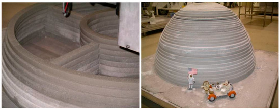 In a feasibility study supported by NASA, Khoshnevis and Zhang utilized the CC technique to construct a lunar outpost [21]. In this research study, a dome-shape habitat composed of sulfur concrete and sintered regolith was constructed (Figure 8). Sulfur concrete can be produced by mixing pure sulfur and regolith [68]. Pure sulfur can be obtained via the decomposition of troilite minerals (FeS) found in lunar/Martian regolith [21], thereby dramatically reducing transportation costs. The researchers reported that the dome-shape structure constructed using the CC technique had a compressive strength close to 55 MPa, which is highly considerable. For comparison, the compressive strength of common terrestrial concrete varies from 17 MPa to 28 MPa [88].
