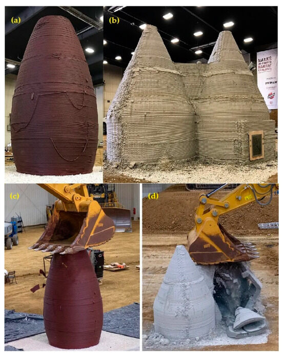 The 3D-printed outpost structures by the AI Space Factory team (a) and PENN State team (b). The performance of the outpost structures under compression tests (c,d) [79].
