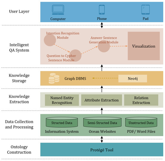 Domain-specific knowledge graphs have been applied in various fields such as healthcare, education, engineering, and finance, employing different approaches to design logic concepts. Gao et al. [4] integrated genotypic and phenotypic databases to construct a drug–disease knowledge graph, inferring the drug indications based on the captured genotypic and phenotypic features. Liu et al. [5] established a Chinese marine medicine ontology, leveraging Neo4j to build the knowledge graph. This framework facilitated the retrieval of the data from the Marine Traditional Chinese Medicine atlas database. To effectively manage marine accident knowledge, Fu et al. [6] constructed the knowledge graph by combining top-down and bottom-up methods. Due to the professionalism of knowledge in the field of ocean engineering, the known methods cannot be directly applicable to the KG in this field.