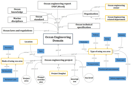 Ontology describes the relations and semantics between concepts in a certain domain and standardizes the representation of knowledge in the domain [22]. Although fully automated ontology establishment is efficient, errors will remain without expert supervision. Therefore, we invite the domain experts to manually develop the concept of relation in ontology and translate the table structure of the marine information system database to classes, attributes, and relations using the seven-step process [23]. In the process of ontology construction, one part of the ontology is manually extracted concepts and relations in the field of ocean engineering by experts, while the other part automatically extracted structured data from the existing ocean information database.