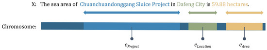 As shown in Figure 3, each input sequence and named entity in the training set is regarded as a chromosome and a gene inside the chromosome, respectively. The named entity randomly chosen in the sequence X is replaced with a marker . Then, we regard X as and store it in the chromosome library . Similarly, the eliminated named entity is stored in the gene bank .