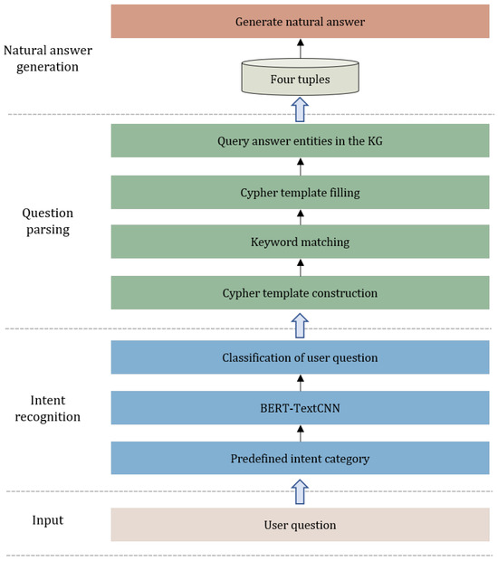 The main function of the answer recommendation module is to analyze user questions in the field of ocean engineering, retrieve the correct answer entities from the knowledge graph, and generate the natural answer. It is composed of three modules: intent recognition, question parsing, and natural answer generation. Figure 5 demonstrates the process.