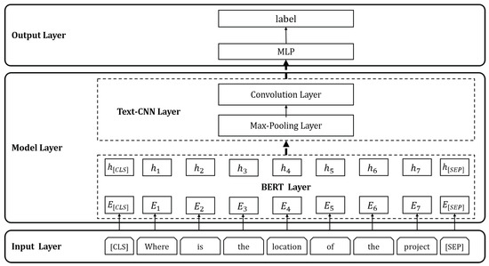 We implement the BERT-TextCNN model to identify the user intentions and guide subsequent answer recommendations. As illustrated in Figure 6, the user question is input into the BERT layer to represent each token in the text as a vector. The vectors are then fed into TextCNN [31], which comprises a convolutional layer, a pooling layer, and a fully connecting layer. Ultimately, the model outputs the intent category to which the user’s question belongs.