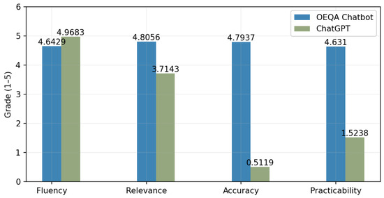 The results revealed that both systems generate fluent natural answers, although ChatGPT obtains a higher relative score of 4.9683 on Fluency. ChatGPT is advantageous in terms of Fluency, which benefits from a large number of parameters. Additionally, OEQA Chatbot achieves improvements of 1.0913, 4.2817, and 3.1071 in Relevance, Accuracy, and Practicality, respectively. The reason for the analysis is that the stored knowledge in the OEQA Chatbot is more fine-grained in this field. In contrast, ChatGPT has the problem of an inaccurate understanding of the user’s intentions and provides precise answers and guidance. Therefore, the OEQA Chatbot has a good performance in intelligent question-answering in the ocean engineering field.