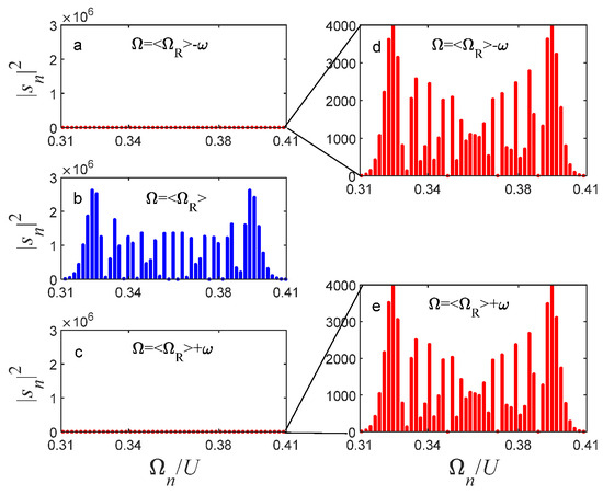 The same parameters as in Figure 5 but with the amplitude . The output spectrum is presented for different incoming energies. (a) and (c): The current suppression criterion: Equation (48) for (the intersection between the red curves in Figure 5b, i.e., destructive interference in both directions). The scenarios (a) and (c) are enlarged in (d) and (e), respectively. (b): The activation criterion: Equation (49), for (the intersection between the blue curves in Figure 5b), i.e., constructive interference in both directions. Note the resemblance between the two cases: .