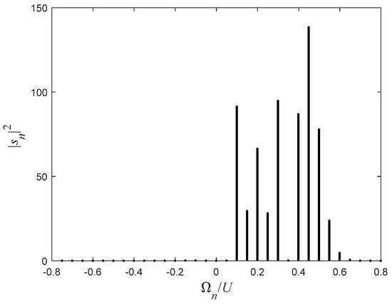 The parameters are as in Figure 9 for and . This scenario is represented by the far-right blue arrow in Figure 9. The lower part of the spectrum is suppressed; therefore, all the spectral components are positive and there is a finite probability of escaping from the varying well and tunneling out through the barrier. In that case, the transmission is suppressed; however, it cannot reach zero.