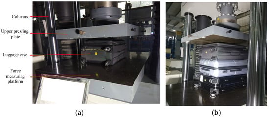 The testing machine in the compression test, including four columns, an upper pressing plate, a force-measuring platform, and data acquisition equipment, is shown in Figure 2a. The luggage case was compressed using the compression device, and the four columns guided the upper pressing plate to compress vertically.