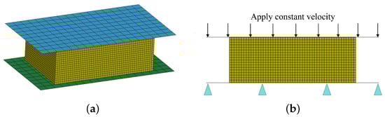 CATIA and HYPERMESH were used to establish the geometric model and the FEM of the luggage case, as shown in Figure 3a. To simulate the test process, the luggage model was placed on fixed, rigid ground, and the upper rigid plate compressed the luggage model at a certain constant velocity value, as shown in Figure 3b.