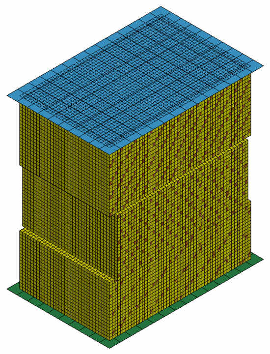 For the compression test of stacked suitcases made of three different materials, the stacked luggage was replaced by a unified overall model to consider the response of the entire cargo in the test. The FEM is shown in Figure 4. However, because the simulated luggage compartment was made of a light and soft foam material, it could easily generate negative volume in the calculation process; thus, the generation of negative volume was prevented by surrounding its shell with an outer layer. The luggage cases and rigid plates were simulated using hexahedral solid elements and quadrilateral shell elements, respectively.