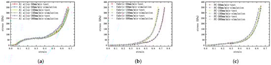 The stress–strain curves obtained from the simulation calculation and test under 50, 150, and 300 mm/min working conditions for the aluminum alloy, canvas fabric, and PC plastic luggage cases are shown in Figure 6a, Figure 6b, and Figure 6c, respectively. A comparison of the stress–strain curves of the simulation and the test results under different working conditions showed that the simulation results of the three materials were highly consistent with the test results; the curves were also in good agreement.