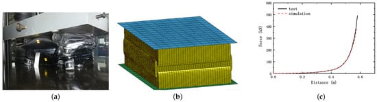Figure 7 shows the comparison of the stacked luggage compression test and simulation with three different materials. Figure 7a,b shows the compression deformation of the suitcases in the test and simulation, respectively. It can be seen that the deformations of the suitcases in the test and simulation were consistent. A comparison of the force–distance curves of the simulation and test (Figure 7c) of stacked luggage compression shows that the coincidence of the two curves was excellent, indicating that the simulation results of the compression process of stacked suitcases made of different materials were good.