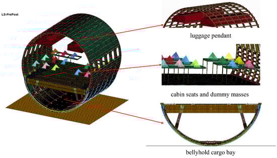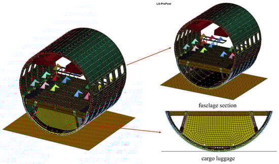 In this study, special compression tests were conducted on luggage, and the stress–strain curves of the luggage were obtained. A verified FEM of the fuselage section is selected in Section 4. The FEM of the fuselage section model with cargo luggage is shown in Figure 13.