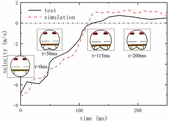 The velocity–time curves of the simulation and test are compared in Figure 9. The starting time of impact was 0 (time = 0 ms). The velocity increased as the time of impact increased. The deformation in the lower region of the fuselage frame gradually increased. The simulation and experimental curves are staggered upwards, and the trend remains identical. When the simulation and test velocity values were 0 m/s, the times were 115 ms and 122 ms respectively, with a difference of only 7 ms. The velocity of the two curves started from values greater than 0 m/s, indicating that the fuselage frame started to rebound. During rebound, the simulation velocity was slightly greater than the test velocity. This is mainly because in the simulation model, the ground model for fuselage frame impact was a rigid plate, but in the actual experiment, it was a force-measuring platform, which absorbed some energy under the large impact, which led to the rebound velocity of the simulation result in the second half of the curve being higher than the experimental result. In addition, there were model simplification, experimental environment, the initial state of the test piece, and other aspects of the impact. In general, the simulated velocity–time curve correlated well with the test result.