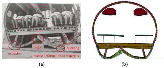 Deformation of the fuselage section in the test and simulation. (a) Test. (b) Simulation.