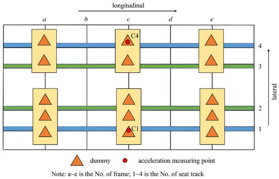The acceleration measuring point of the passenger compartment floor plane was located at the intersection of the floor beam and seat rail. The layout of the dummies in the passenger compartment is shown in Figure 11. a–e correspond to the numbers of the floor beams. Triple seats were installed on rails 1 and 2, and double seats were installed on rails 3 and 4.