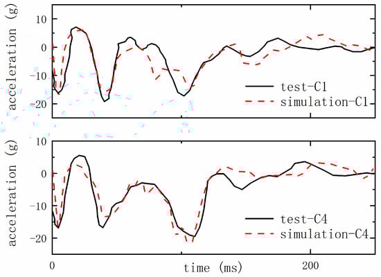 A comparison of the acceleration–time curves of the simulation and test at C1 (intersection of floor beam c and seat rail 1) and C4 (intersection of floor beam c and seat rail 4) is shown in Figure 12. At C1, the test initial peak acceleration was 16.2 g, and the simulation initial peak acceleration was 17.6 g, which was 8.6% higher than the test initial peak acceleration. At C4, the test initial peak acceleration was 17.1 g, and the simulation initial peak acceleration was 17.2 g, which was 0.5% higher than the test initial peak acceleration.