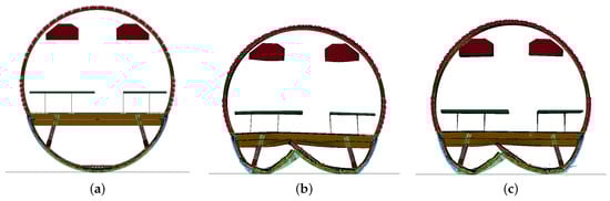 Deformation diagrams of fuselage frame without cargo luggage. (a) t = 0 ms. (b) t = 100 ms. (c) t = 180 ms.