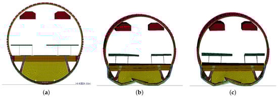 Deformation diagrams of fuselage frame with cargo luggage. (a) t = 0 ms. (b) t = 100 ms. (c) t = 180 ms.