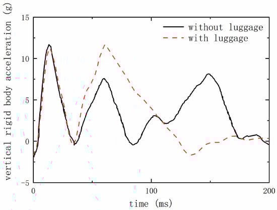 The vertical acceleration curves of the fuselage section without and with cargo luggage are shown in Figure 16. At approximately 13 ms, the first peak acceleration occurred after the two models touched the ground. The acceleration of the model without cargo luggage was slightly greater than that of the model with cargo luggage. However, at approximately 60 ms, the acceleration response curve with the cargo luggage model had a secondary peak value, which was greater than the acceleration value of the model without cargo luggage at that time. This is because cargo luggage, as a relatively soft structure, plays an energy-absorbing and buffering role in the crash process but it limits the subsequent deformation of the lower structure of the cargo hold floor, rendering it impossible for the lower structure to absorb the impact through further deformation. At approximately 103 ms, a small peak was observed in the acceleration response curve in the model without cargo luggage, and this was caused by the cargo floor tilting and coming into contact with the cabin floor. At approximately 148 ms, the pillars on both sides of the cargo hold of the model without cargo luggage touched the ground, resulting in the final peak of the curve; then, the acceleration gradually stabilized at about 0. As the cargo luggage had the function of energy absorption and buffering, the deformation of the fuselage frame was small; thus, the last two peaks relative to the curve without cargo luggage were not present here. After 75 ms, the acceleration gradually decreased and finally stabilized at approximately 0 g.