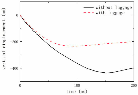 The vertical displacement curves of the fuselage section without and with cargo luggage are shown in Figure 17. The maximum displacement value of the fuselage with cargo luggage was 234 mm when t = 90 ms, and that of the fuselage without cargo luggage was 433 mm when t = 150 ms. This shows that the vertical displacement of the fuselage section with cargo luggage is less than the vertical displacement without cargo luggage; thus, the presence of luggage ensures the integrity of the passenger living space of the cabin structure to the greatest extent.