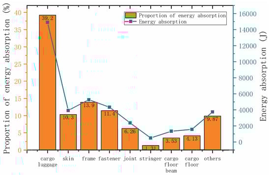 - Cargo luggage, fuselage frames, fasteners, and skin were the main energy absorption components, and the absorption of energy of cargo luggage was the largest of all components, accounting for 39.2% of the total energy absorption. The energy absorption of the fuselage frames, fasteners, and skin accounted for 13.9%, 11.4%, and 10.3%, respectively.
