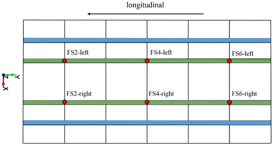 To study the load transmitted from the fuselage cargo structure to the cabin during the crash, the acceleration response of the cabin seat rail was mainly studied. A total of six acceleration measuring points were selected on the inner floor guide rail of the cabin, as shown in Figure 19. The vertical lines in Figure 19 represent the fuselage frames, and the numbers are FS1-FS7 from left to right. The green and blue lines in the horizontal direction indicate the inner and outer floor guide rails of the cabin, respectively. The six acceleration measuring points are located at the intersection between fuselage frames FS2, FS4, and FS6 and the inner floor guide rail of the cabin, respectively.
