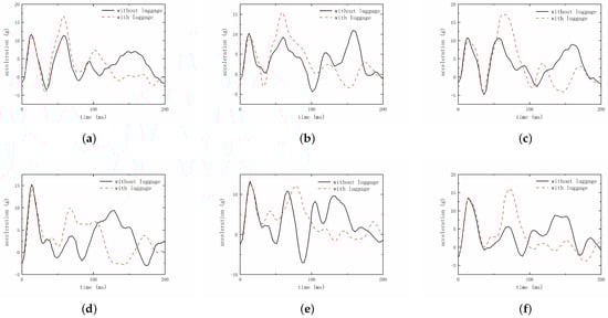 Comparison of acceleration responses of guide rail with and without cargo luggage in the fuselage section. (a) FS2-left. (b) FS4-left. (c) FS6-left. (d) FS2-right. (e) FS4-right. (f) FS6-right.