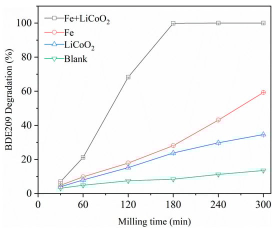 MC degradation of BDE 209 with different co-milling reagents. Conditions: mBDE 209 = 0.46 g, nLiCoO2/nFe/nBr = 1.5:1.67:1, rotation speed = 600 rpm, ball-to-powder mass ratio (mb/mp) of 100:1.