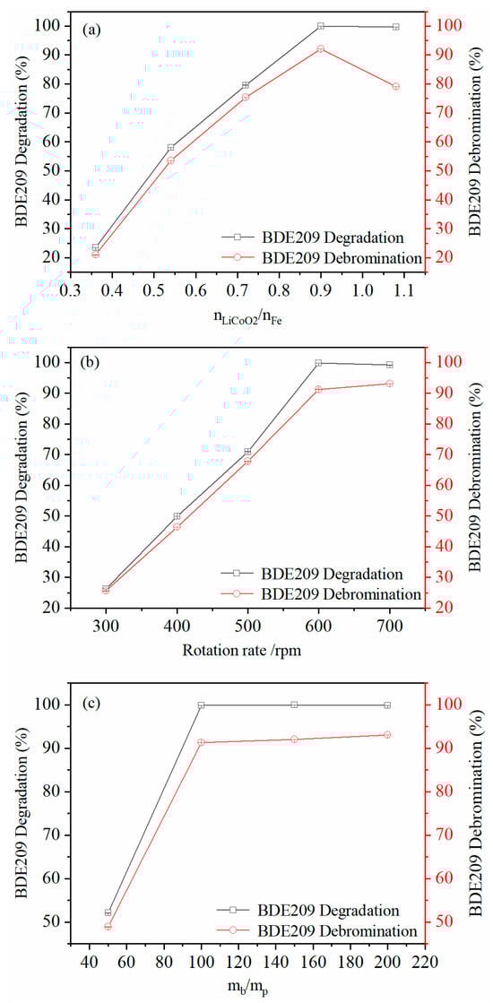 Degradation and debromination of BDE 209 at different ball milling conditions in 240 min. Conditions: (a) The effect of grinding reagent molar ratio between LiCoO2 and Fe (nLiCoO2/nFe) with rotation speed of 600 rpm, and ball-to-powder mass ratio (mb/mp) of 100:1. (b) The effect of rotation rate with nLiCoO2/nFe/nBr = 1.5:1.67:1, and mb/mp of 100:1. (c) The effect of ball-to-powder mass ratio with nLiCoO2/nFe/nBr = 1.5:1.67:1, and rotation speed of 600 rpm.