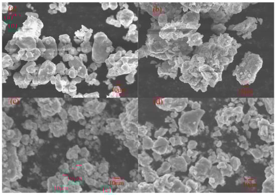 To elucidate the detailed reaction mechanism, physical chemical property changes of the sample powders were examined. Figure 3 shows the morphology of activated samples at different ball-milling times as observed by SEM. It can be seen that the surfaces of the particles became significantly rougher with the extended milling time. These outcomes imply that substantial energy was generated during the MC process and transferred to the samples, resulting in the samples being damaged and inducing the degradation and debromination of BDE 209.