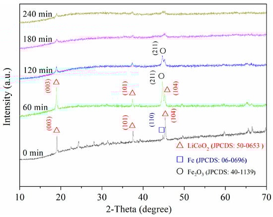 XRD spectra of sample at different milling times. Conditions: nLiCoO2/nFe/nBr = 1.5:1.67:1, mb/mp = 100:1, rotation speed = 600 rpm.