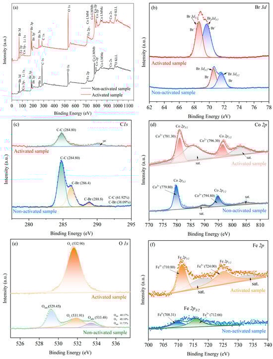 XPS spectra of samples before and after ball milling for 180 min. (a) Full XPS spectra analysis, (b) Br 3d XPS spectra, (c) C 1s XPS spectra, (d) Co 2p XPS spectra, (e) O 1s XPS spectra, (f) Fe 2p XPS spectra. Conditions: nLiCoO2/nFe/nBr = 1.5:1.67:1, mb/mp = 100:1, rotation speed = 600 rpm.